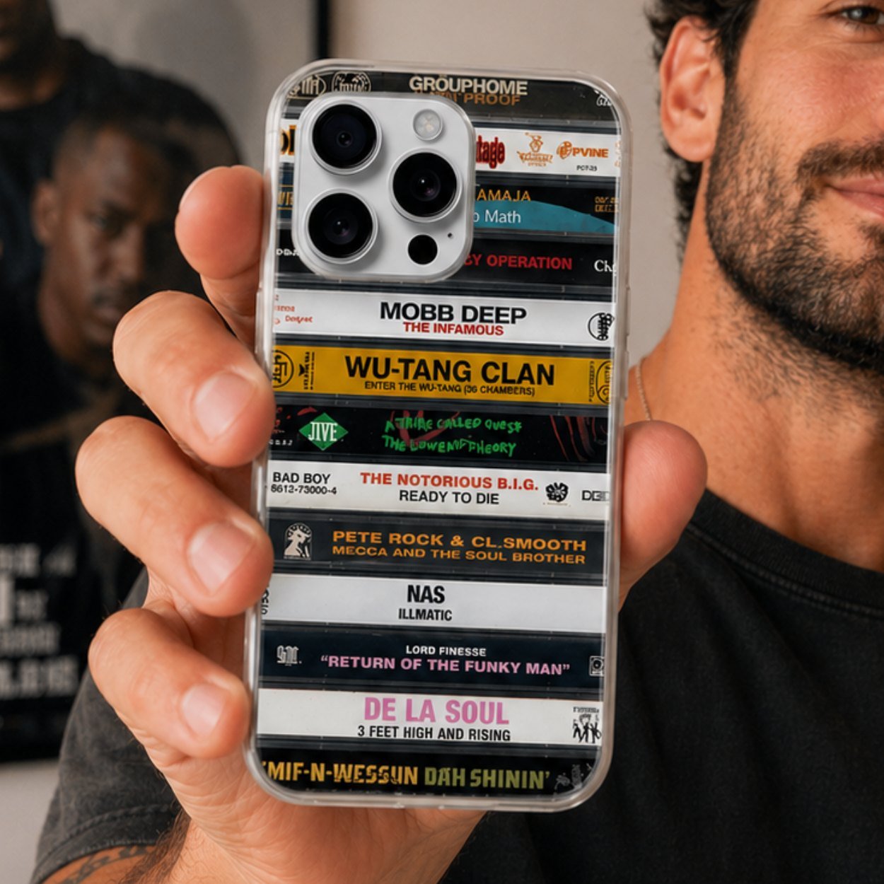 Le visuel de cette coque iPhone K7 East Coast reprend fidèlement des spines de cassettes hip-hop East Coast emblématiques. Typographies marquées, références old school, esthétique brute et authentique : chaque tranche évoque l’énergie des rues de Brooklyn, du Queens ou du Bronx. Une bibliothèque miniature dédiée au boom bap et à la culture DJ.