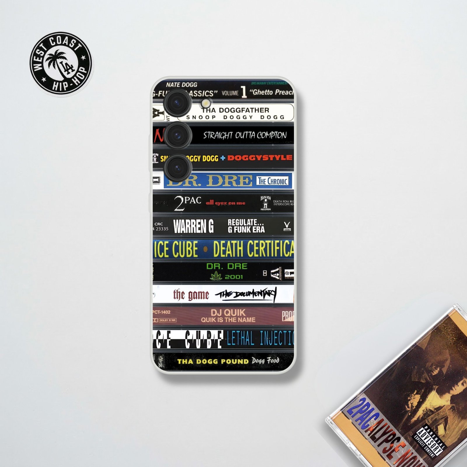 Le visuel s’appuie sur une sélection de spines de cassettes Hip-Hop West Coast, clin d’œil direct à l’esthétique old school des années 90. Titres marqués, typographies brutes, codes visuels reconnaissables entre mille : chaque tranche évoque une époque où le support faisait partie intégrante de la culture musicale.
