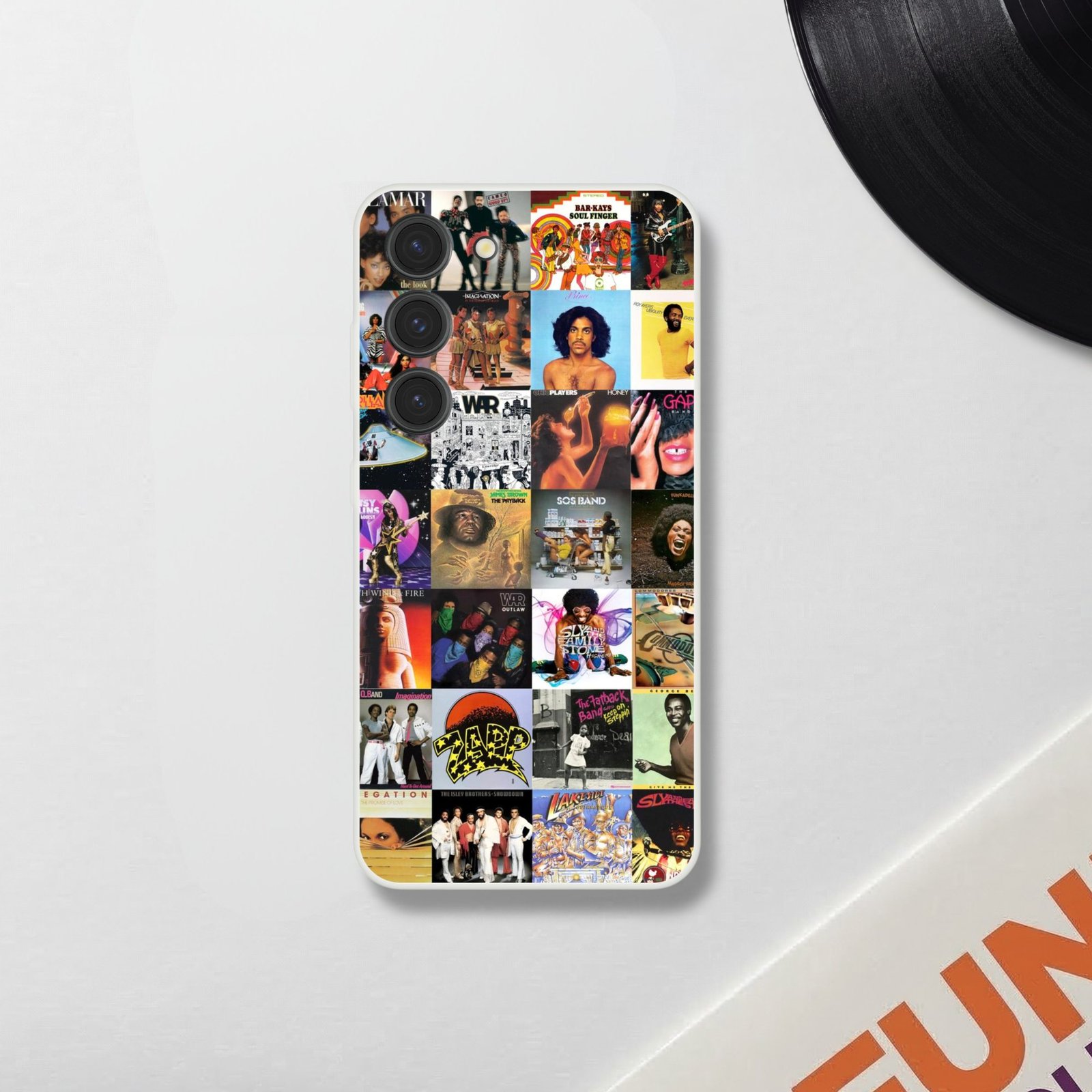 Le visuel de cette coque Samsung flexi vinyles funk rassemble une sélection de pochettes emblématiques : Shalamar, The Bar-Kays, Rick James, Kool & The Gang, Prince, Parliament, Ohio Players, Bootsy Collins, Earth, Wind & Fire, Zapp ou encore George Benson (sélection non exhaustive). Un collage old school pensé pour celles et ceux qui reconnaissent une basse slapée dès la première mesure.