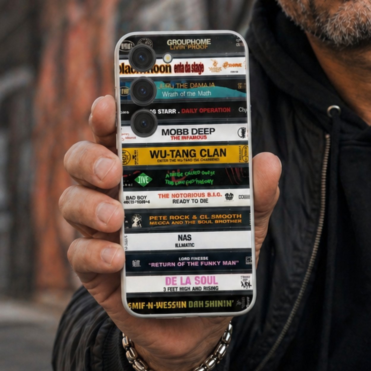 Le visuel de cette coque Samsung K7 East Coast reprend fidèlement des spines de cassettes hip-hop East Coast emblématiques. Typographies brutes, codes graphiques old school, références new-yorkaises affirmées : chaque tranche évoque l’énergie des quartiers où le boom bap a façonné son identité.