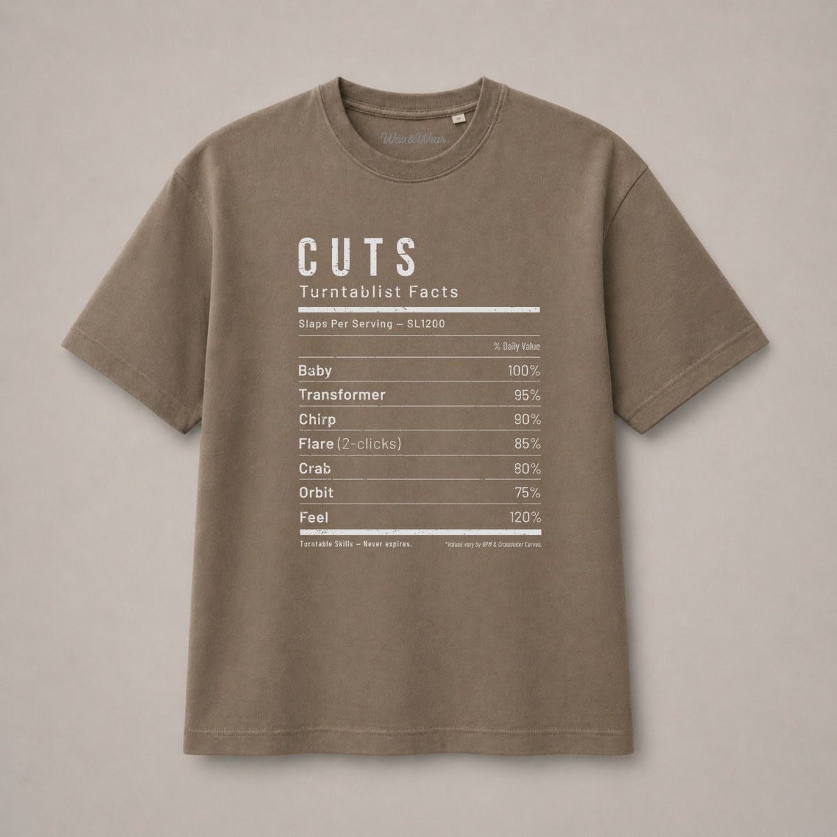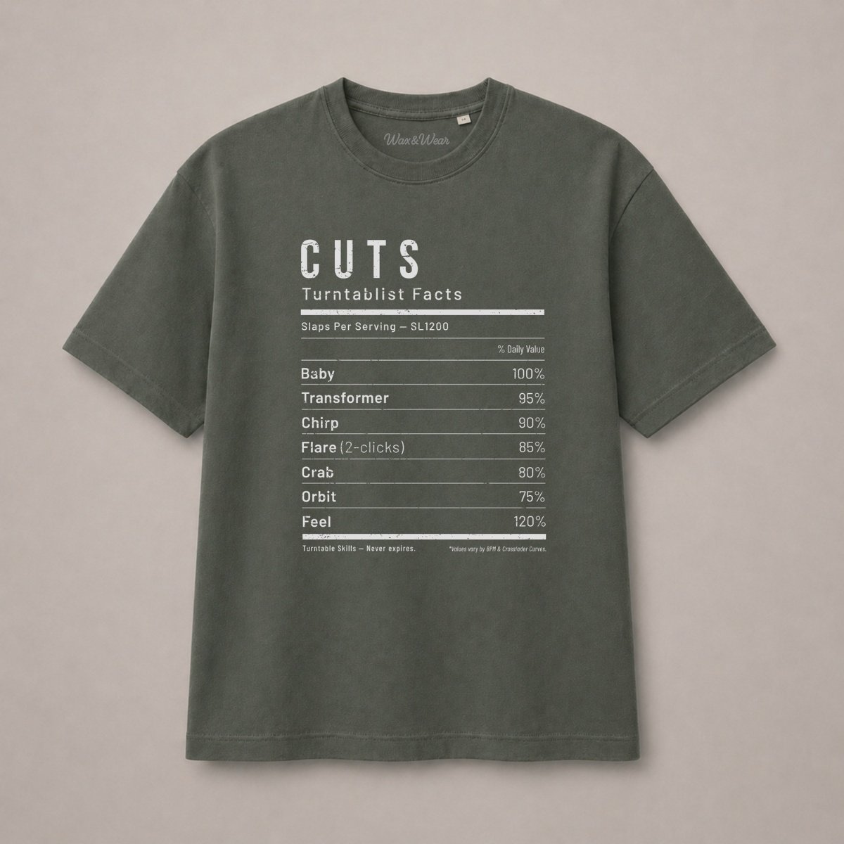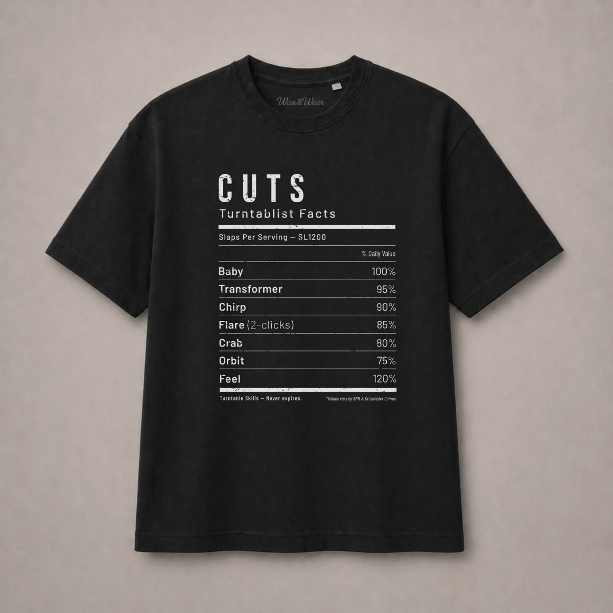 Inspiré du format « Nutrition Facts », le visuel Groove Facts – Cuts décrypte les fondamentaux du turntablism : timing, flow, patterns, et maîtrise du crossfader. Un clin d’œil direct aux DJs qui savent.