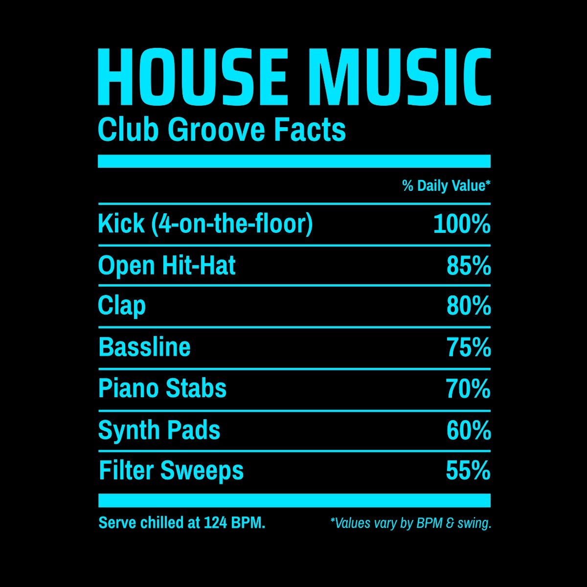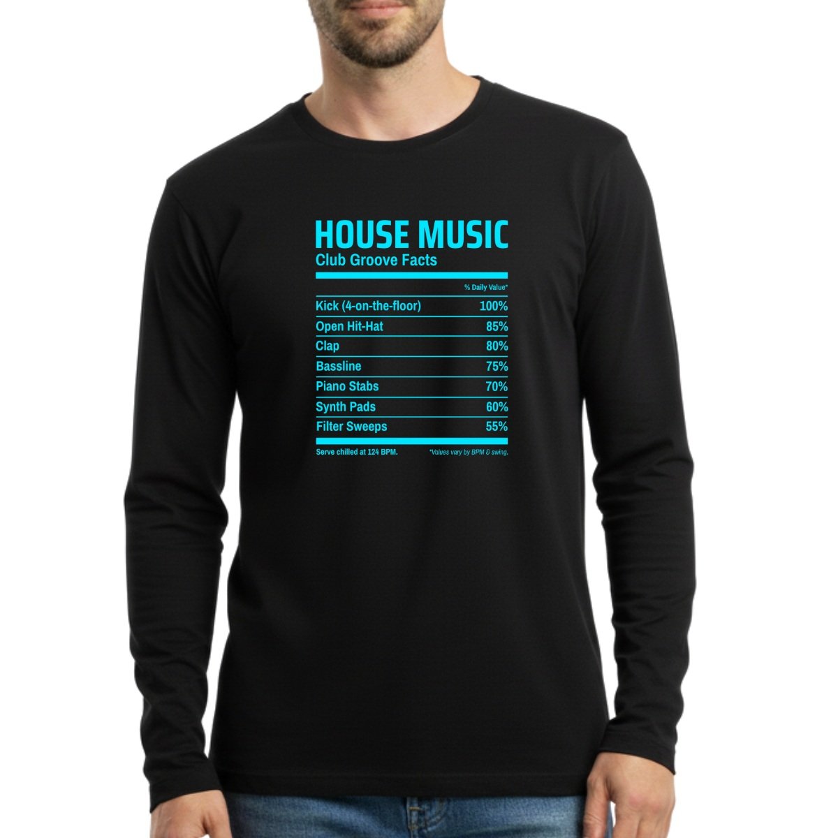 Ce t-shirt homme manches longues signé Wax & Wear rend hommage à la House Music, ce son mythique né dans les clubs de Chicago et devenu l’un des piliers de la culture électronique mondiale. Kicks “4-on-the-floor”, basslines hypnotiques et claps percutants : tout l’ADN du groove club est imprimé ici façon “étiquette nutritionnelle”.