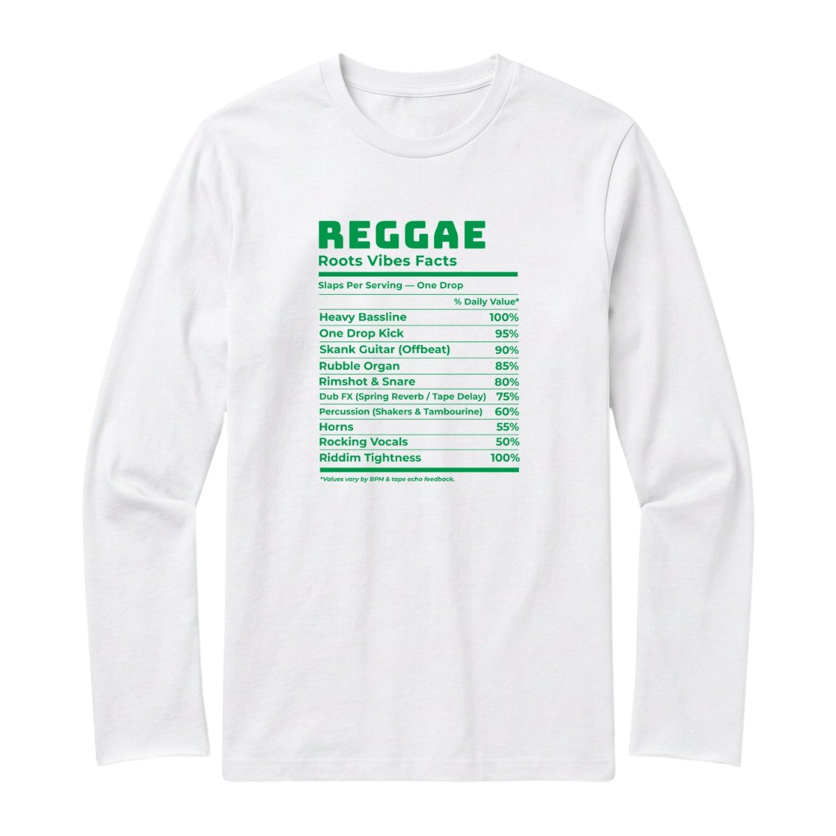 Ce t-shirt reggae homme manches longues signé Wax & Wear rend hommage à la culture reggae, à ses grooves chaleureux et à son esprit roots. Inspiré par les basslines rondes, les skank guitars et les voix vibrantes, le visuel revisite les éléments essentiels du son jamaïcain façon “étiquette nutritionnelle”.