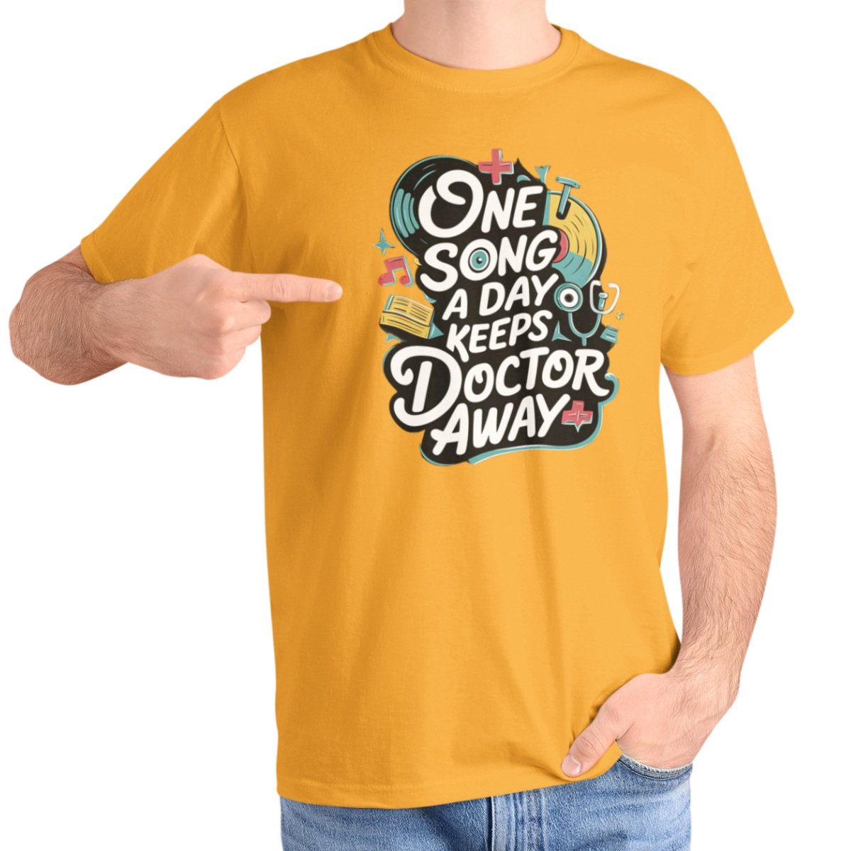 Le t-shirt One Song a Day Keeps the Doctor Away est une ode à la musique comme thérapie quotidienne.